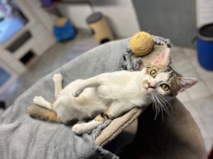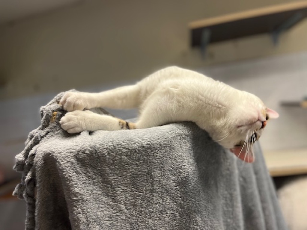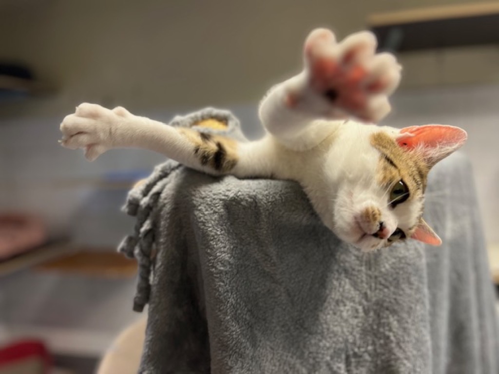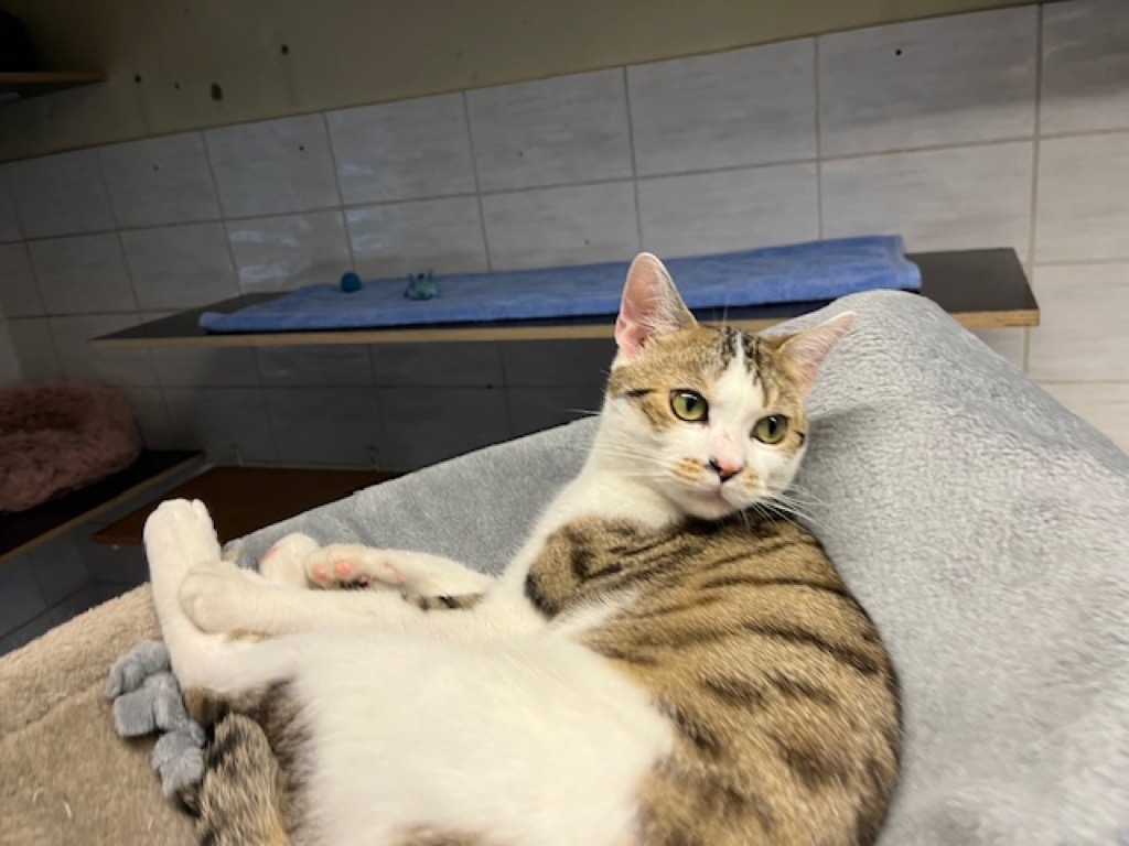 Peo ist etwa 1 Jahr alt und wurde als Fundtier bei uns aufgenommen. Der kleine Frechdachs hat im Nu das Katzenzimmer erobert. Frech wie Oskar und hat er die anderen Artgenossen geärgert – offensichtlich braucht er viel Unterhaltung, sonst wird ihm schnell langweilig. Als er begann zu humpeln, haben wir ihn untersuchen lassen – diese ergab eine sogenannte Femurkopfnekrose. Der Hüftkopf – das runde Gelenkstück oben am Oberschenkelknochen – wird nicht mehr richtig durchblutet.